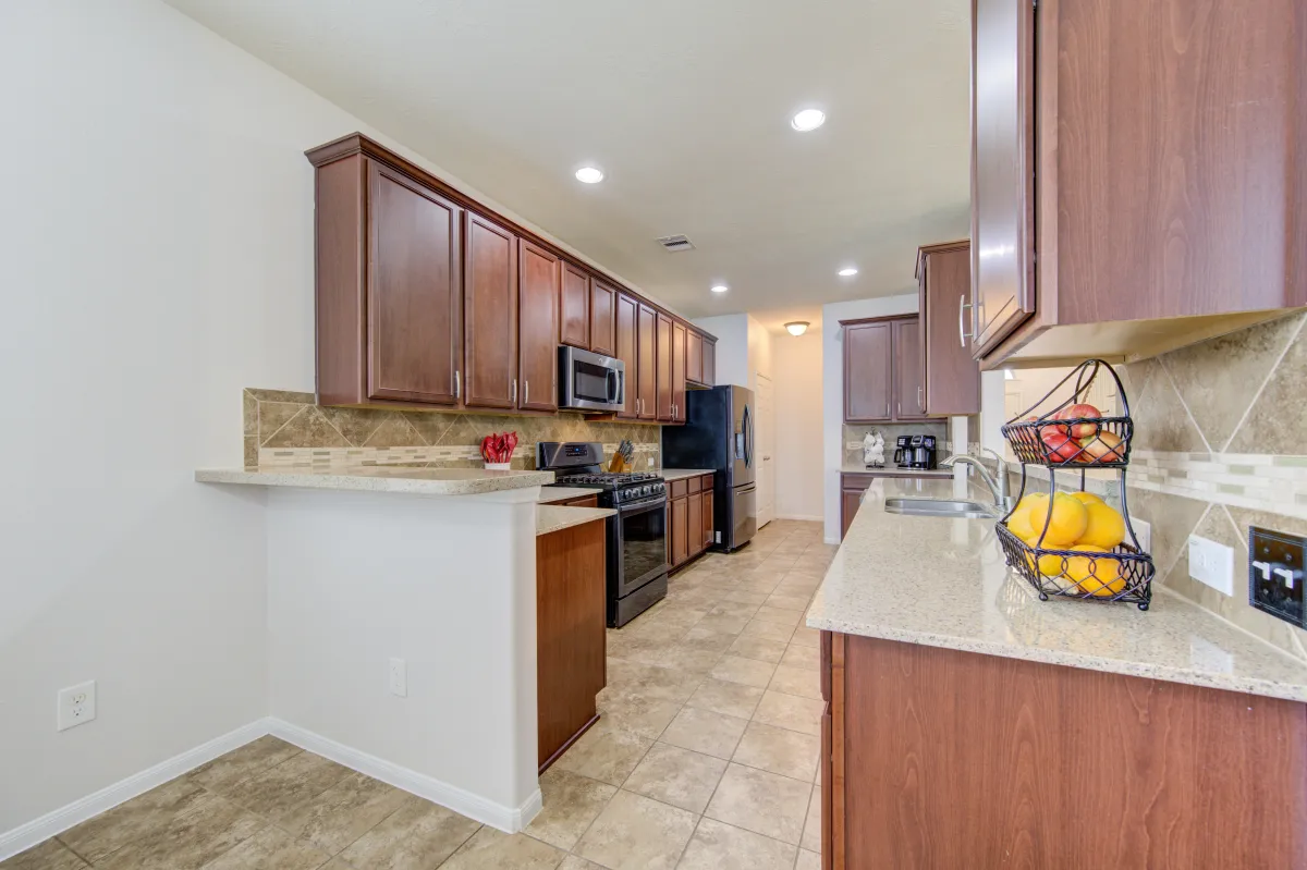 The interior sparkles with fresh paint and new carpet on the second floor, while the main level impresses with all tile flooring. The kitchen is a chef's delight, featuring a breakfast bar, granite countertops, and modern appliances including a gas range and oven, microwave, and dishwasher.